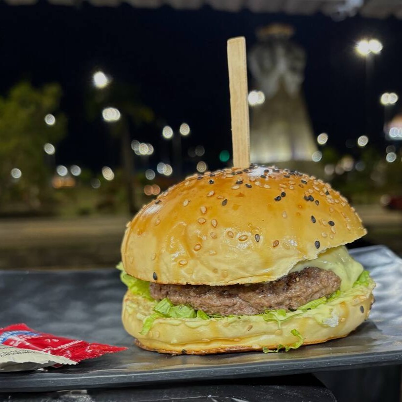 Delicie-se com um hambúrguer de pão de gergelim, blend de carne, queijo prato derretido, alface crocante e pasta de alho.