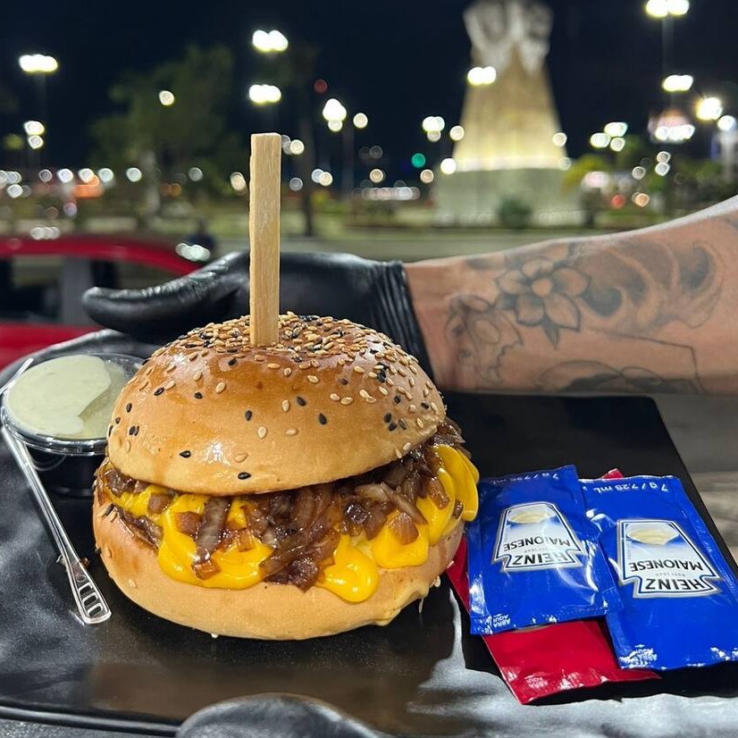 Experimente o sabor do gold burguer com pão de gergelim, blend de carne, queijo prato, alface, tomate, cebola roxa e pasta de alho.