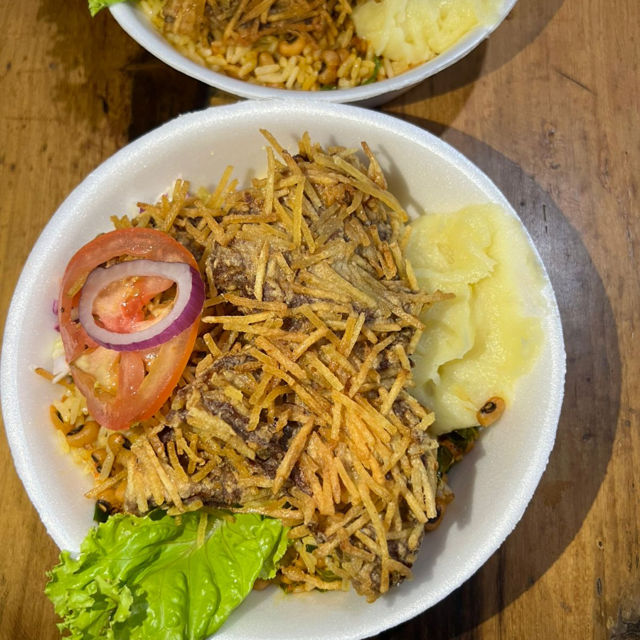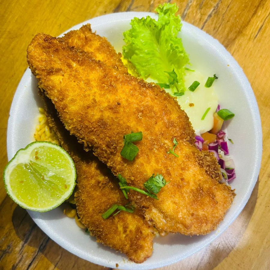 Acompanhamento: Baião, farofa, fritas e salada.