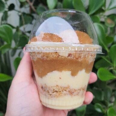 Delicioso bolo no copo montado com Brigadeiro Cremoso de Leite Ninho, Geleia de Cupuaçu e farelo de bolo amanteigado.