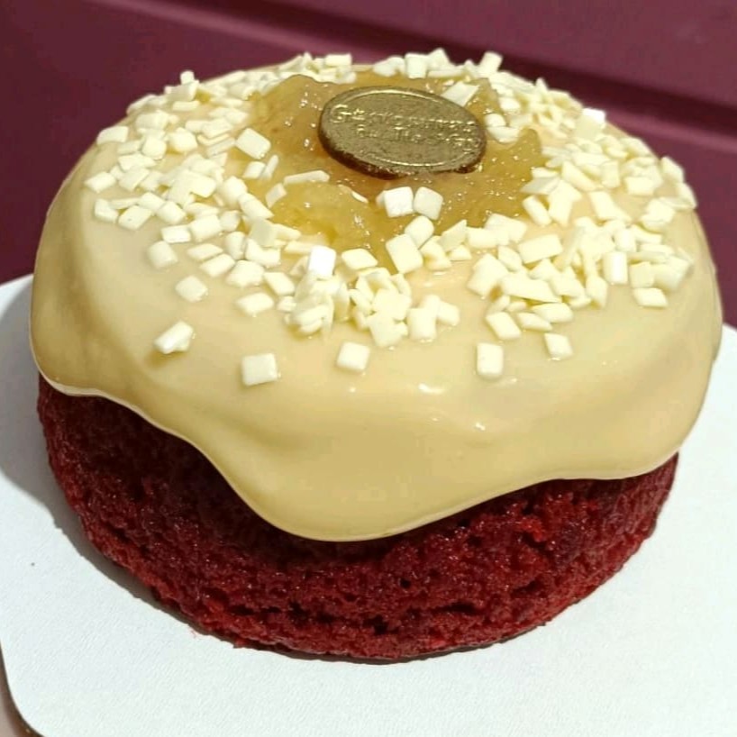 Bolo Red Velvet amanteigado com cobertura de brigadeiro cremoso de leite ninho e geleia de cupuaçu e decorado com confeito de chocolate branco
