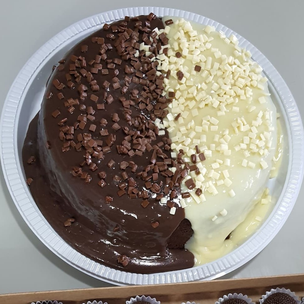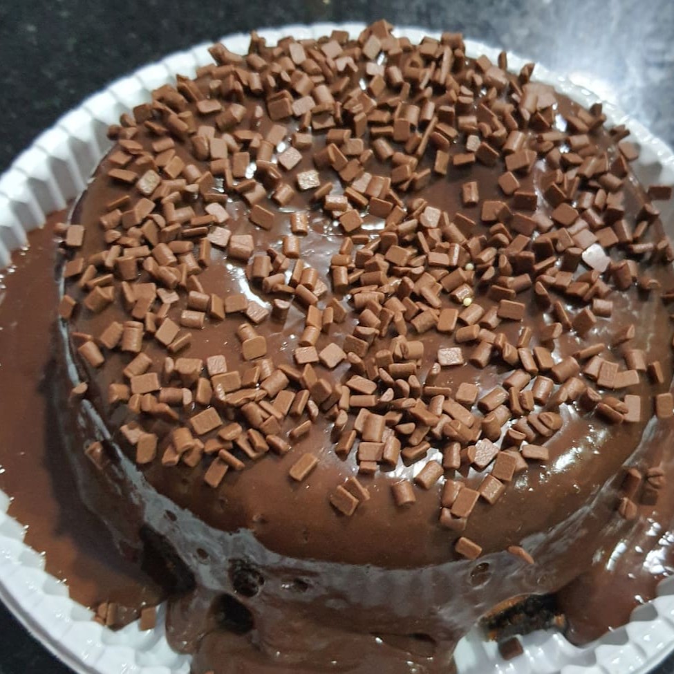 Delicioso bolo de massa amanteigada e cobertura de brigadeiro cremoso