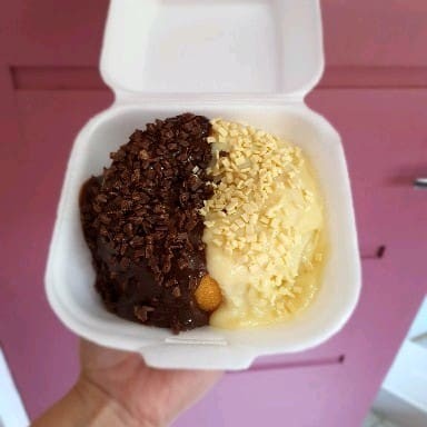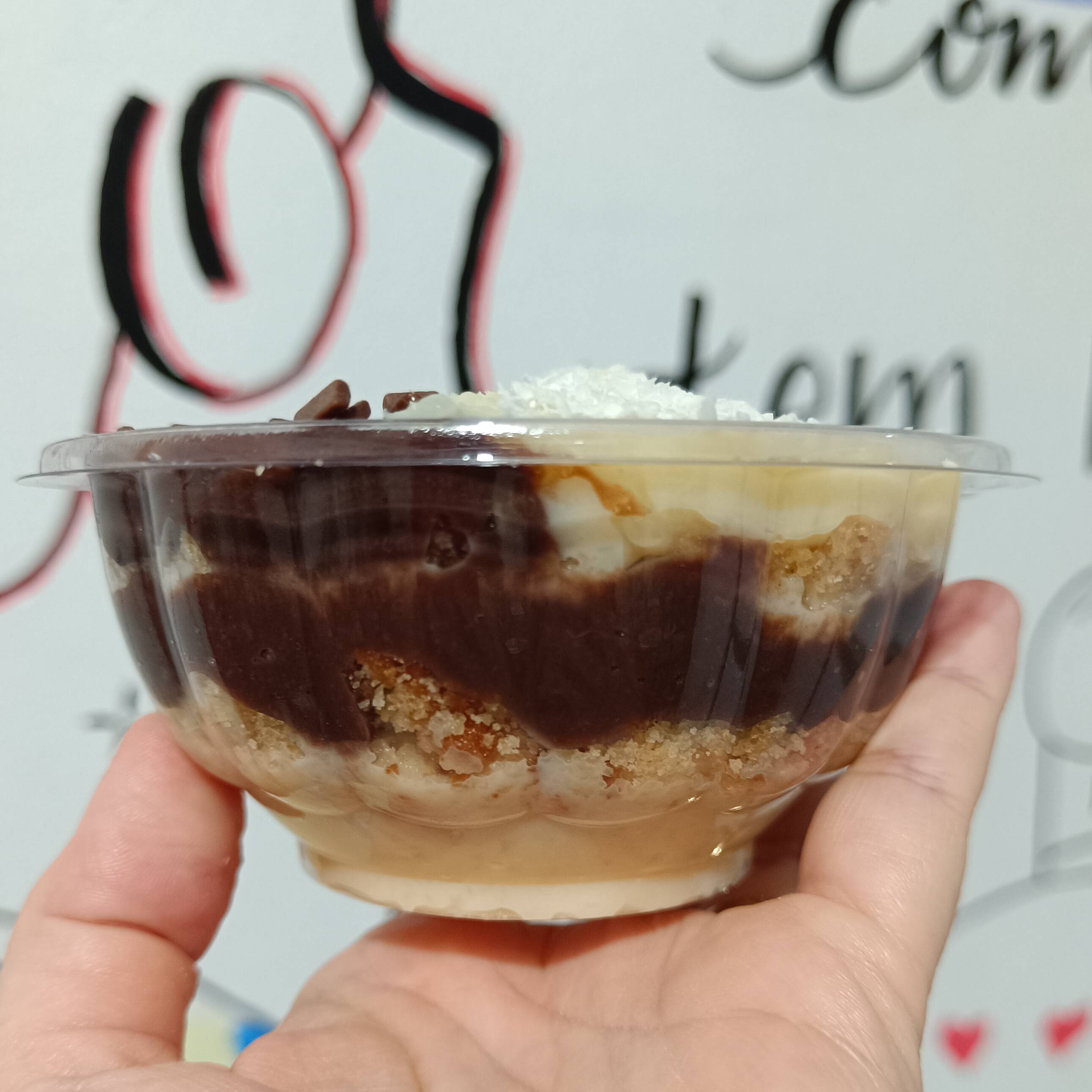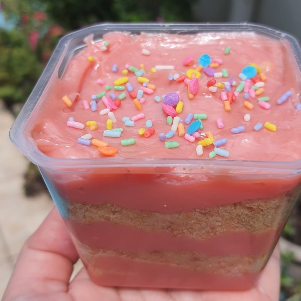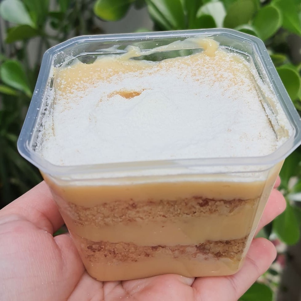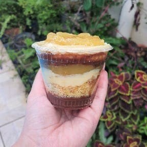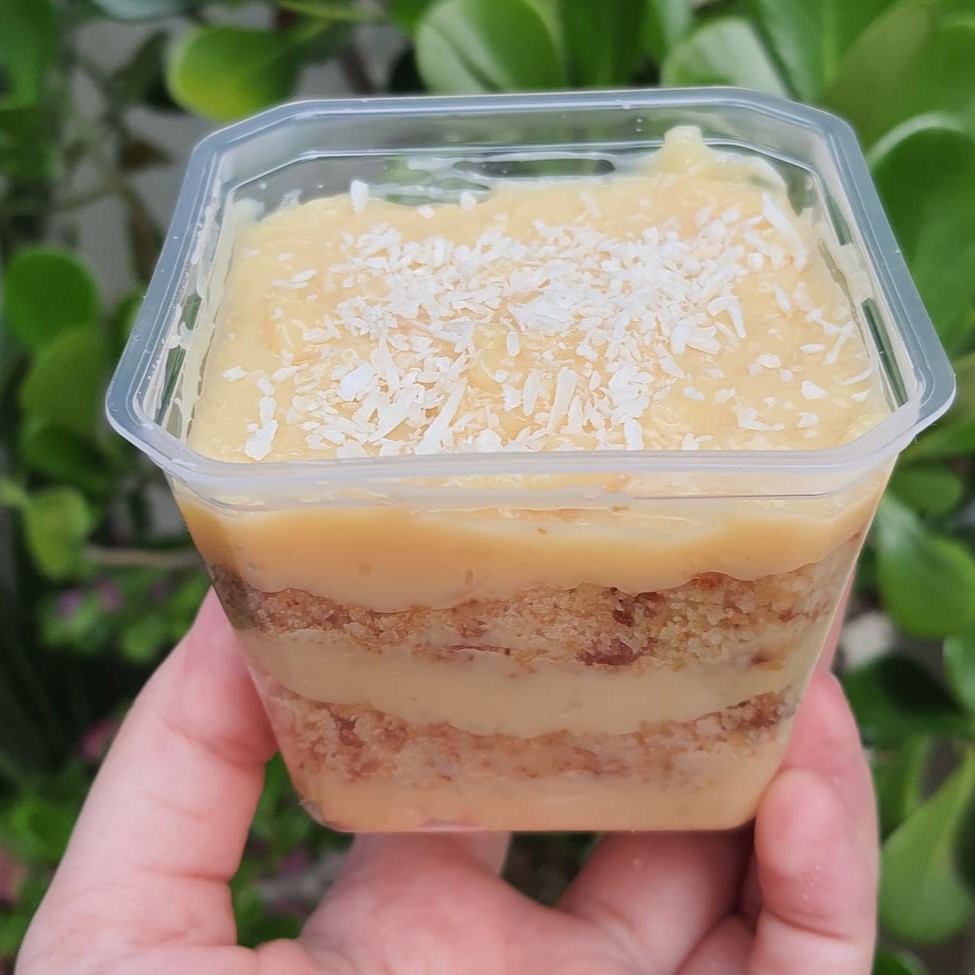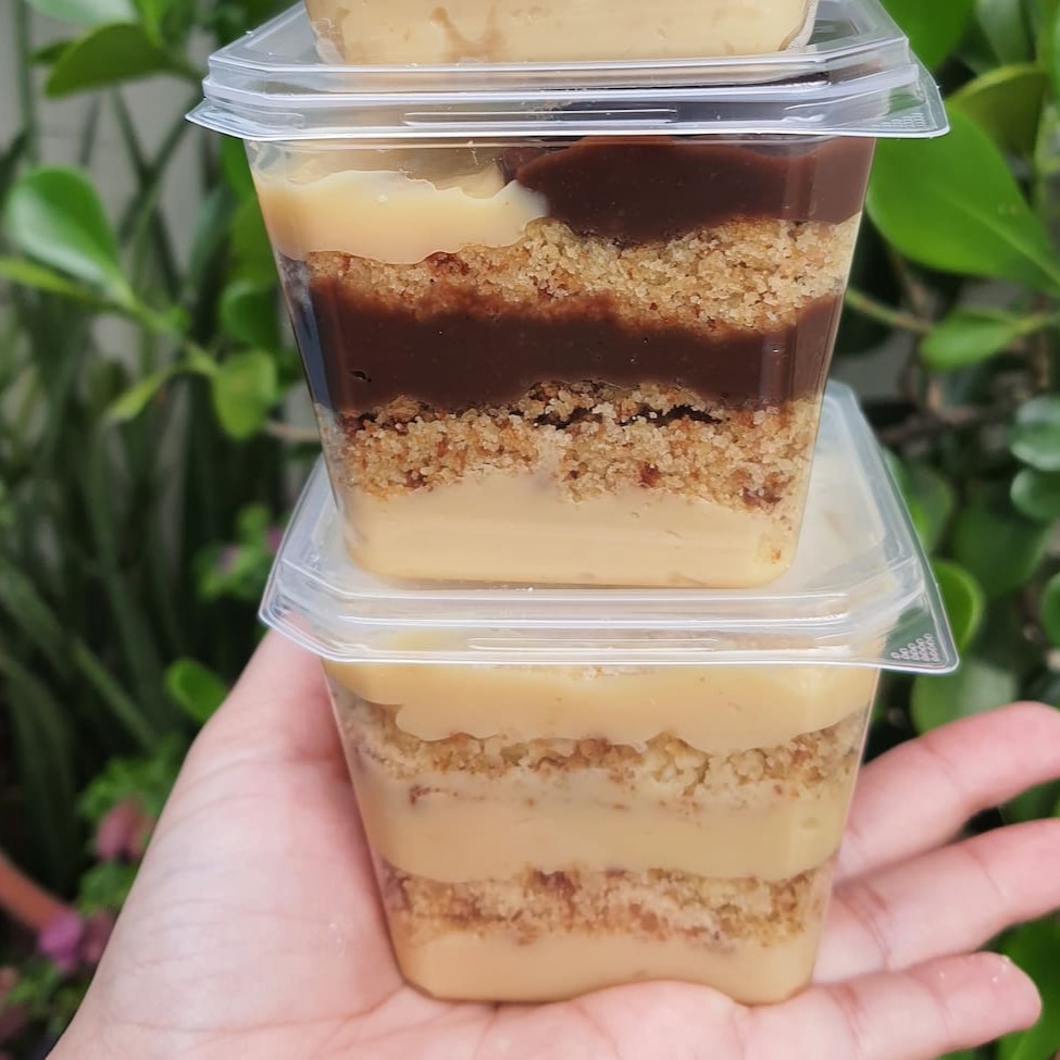Delicioso bolo no copo com camadas de Brigadeiro Cremoso 50% Cacau e de Leite Ninho intercalados com Geleia de Cupuaçu e farelo de bolo amanteigado.