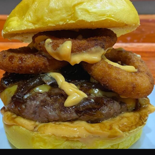 Pão brioche tostado,carne bovina 150g,queijo cheddar, catupiry cebola caramelizada, 1 fatia de bacon e molho barbecue