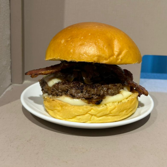 Pão brioches , Carne bovina 100g amassada na chapa, queijo cheddar bacon caramelizado, Alface com nosso delicioso maionese de bacon