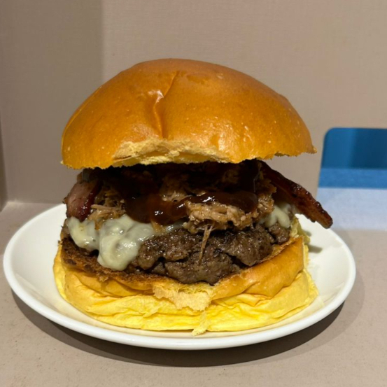 Pão brioche tostado,carne bovina 150g,queijo cheddar, uma fatia de bacon, costela suína desfiada e nosso molho barbecue.