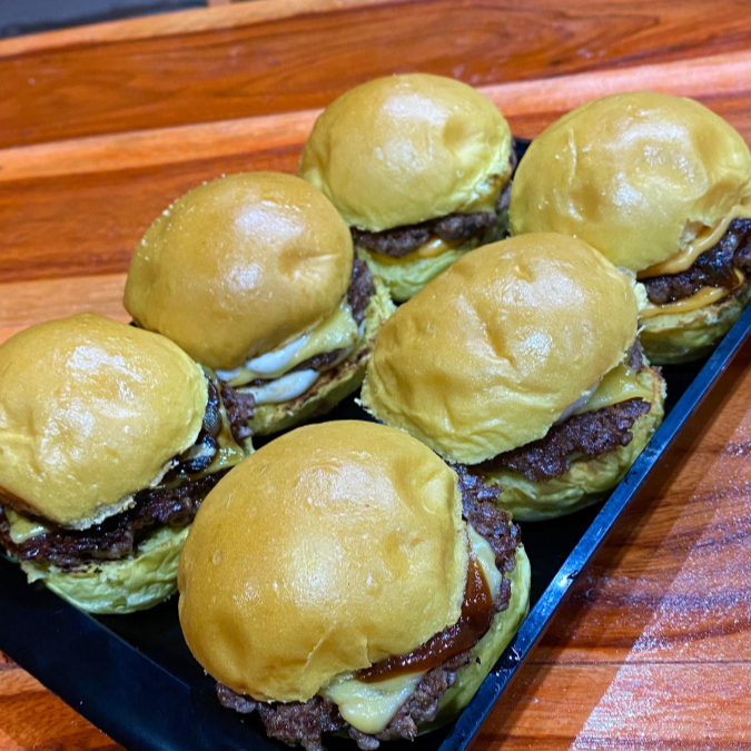 6ud de pão mini com blend de 50g cada, queijo cheddar, com molhos variados e uma batata frita de 100g.