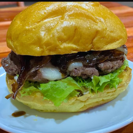 Pão brioches , Carne bovina 100g amassada na chapa, Cebola caramelizada, Alface com nosso delicioso molho smoked