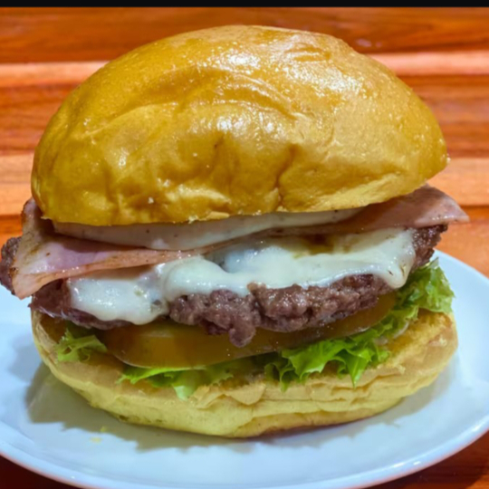 Pão brioches tostado, Carne bovina 100g amassada na chapa, queijo mussarela, Presunto suíno, Alface e Tomate como molho smoked