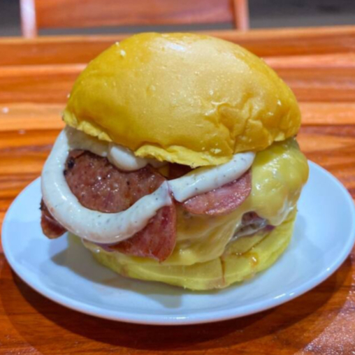 Pão brioche,carne bovina 150g,queijocheddar,calabresa fatiada com nosso delicioso molhos smoked