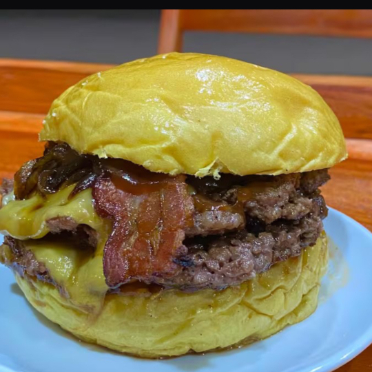 Pão brioche, 2ud de carne bovina de 150g queijo cheddar bacon fatiado, cebola caramelizada Alface e tomate com maionese de bacon