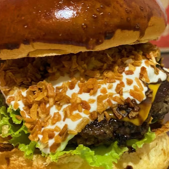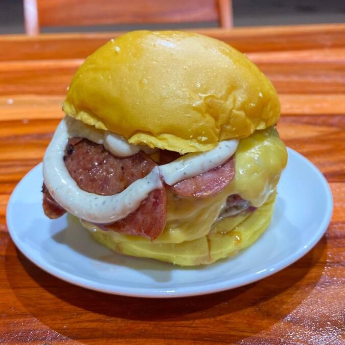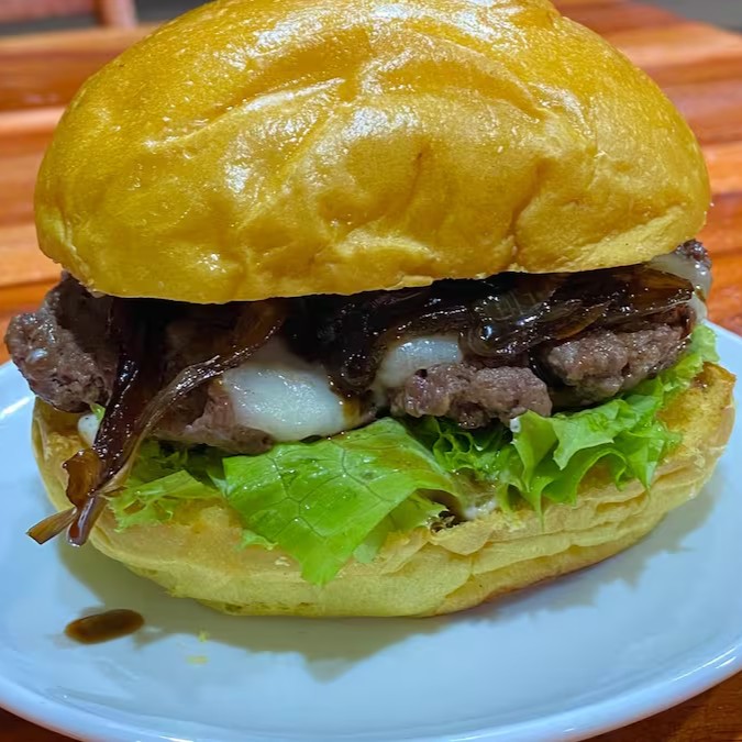Pão brioche, suculenta carne bovina de 100g amassada na chapa, queijo prato derretido, alface e cebola caramelizada. Para finalizar, um molho smoked.