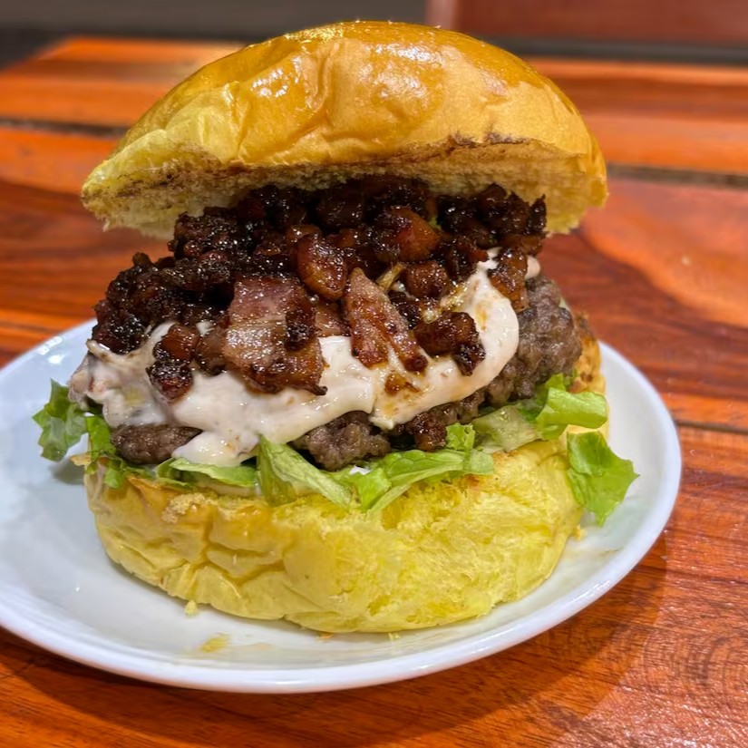 Pão brioche, smash de blend bovino 100g, queijo prato, Alface, deliciosos bacon caramelizado, regado com maionese de bacon defumado.