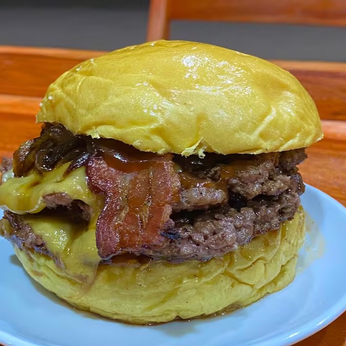 Pão broche, 2 blend bovino 150g,2 fatias de queijo prato, bacon fatiado, Alface, Tomate, cebola caramelizada, com deliciosa maionese de bacon defumado.