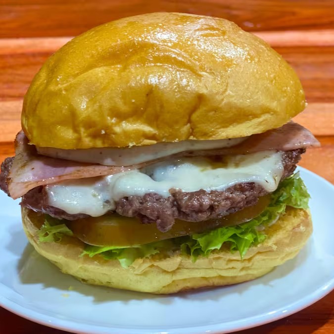 Pão brioche, suculenta carne bovina de 100g amassada na chapa, queijo mussarela e presunto fatiado, alface e tomate. Para finalizar, um toque especial é dado pelo nosso exclusivo molho smoked.