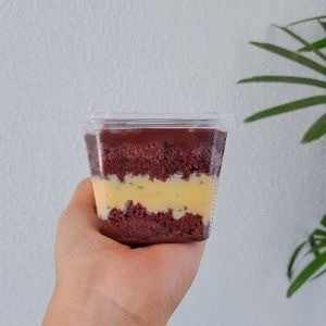 Pote de 250ml com camadas intercaladas de bolo e recheio goumert de Chocolate e recheio de Maracujá.