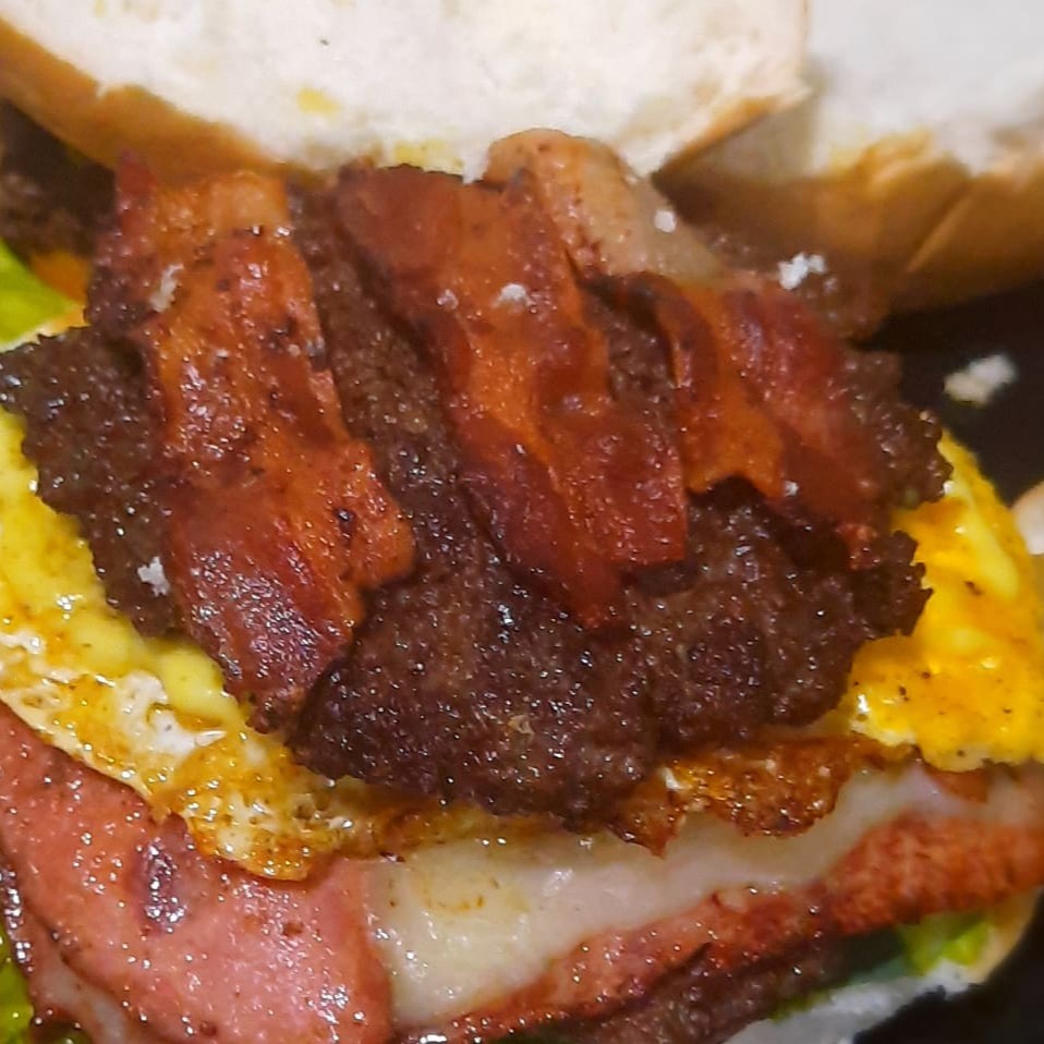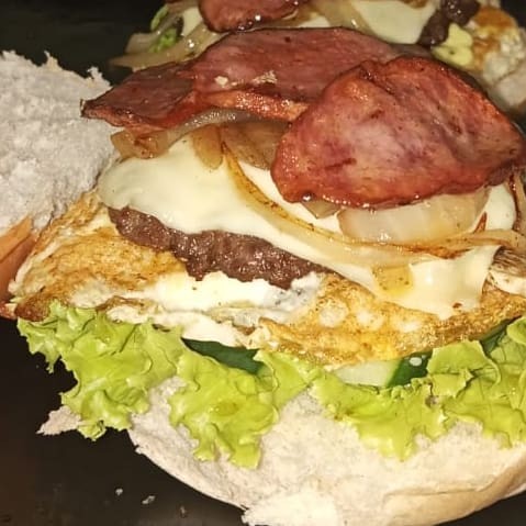 (Pão Bola, Duas Carnes, Ovo, Queijo, Presunto, Calabresa, Bacon, Salada e Cebola Chapeada)