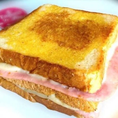 3 Fatias de pão de forma, 2 ovos, 2 queijo e 2 presunto.