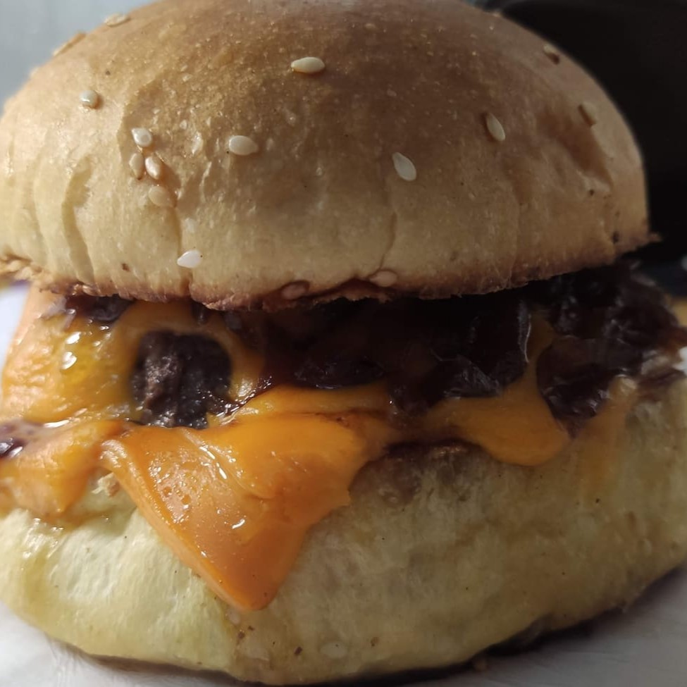 Pão, Blend de 180g (20% peito, 80% fraldinha), Queijo Prato e Cebola Caramelizada.