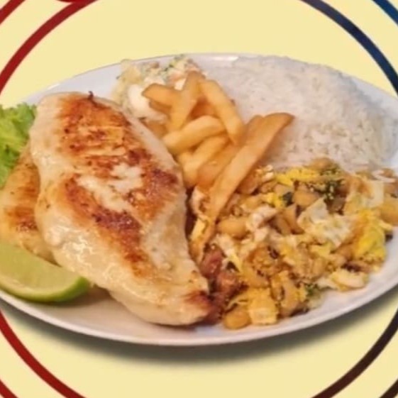180g de peito de frango, arroz, salada, Batata frita.