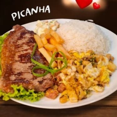 Picanha na Chapa, arroz, batata frita, legumes frito.