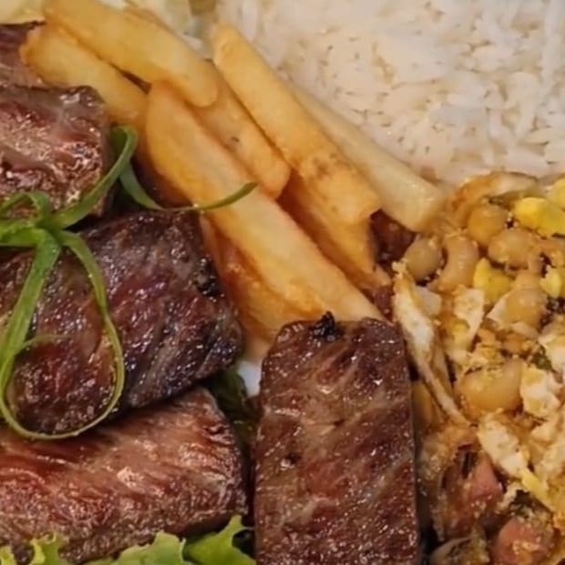 Charque cortados em cubos e fritos na chapa, Arroz, Feijão Tropeiro, Batata Frita e Salada Verde