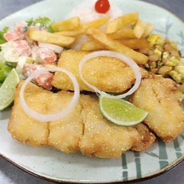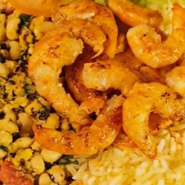 300g de Camarão Rosa, Arroz, Batata Frita, Salada Verde e Legumes Frito.