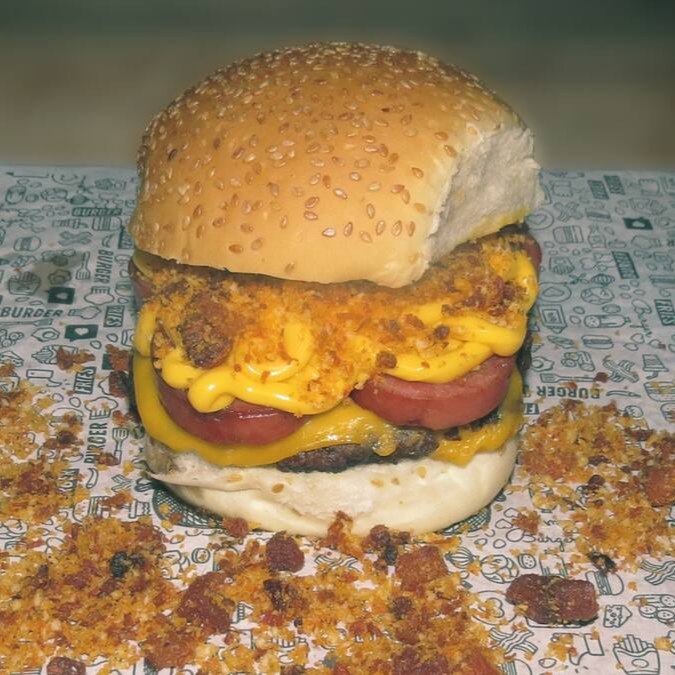 Pão manteigado, carne de 145g, queijo cheddar, calabresa, cheddar e farofa de bacon com farinha panko.