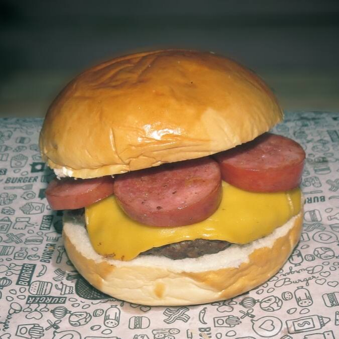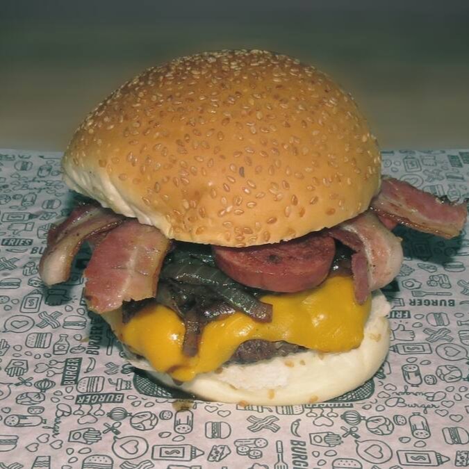 Pão amanteigado, carne de 140g, queijo cheddar ou mussarela, cebola caramelizada, calabresa e bacon.