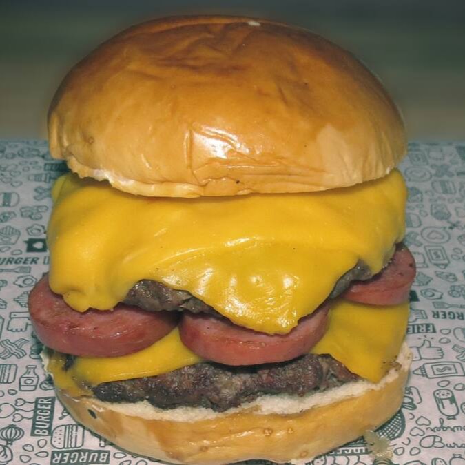 Pão amanteigado, 2 carnes de 140g, calabresa e cheddar em cheddar.