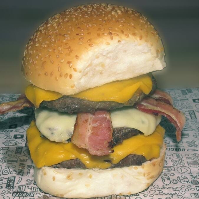 Pão amanteigado, 3 carnes de 140g, queijo cheddar mussarela cheddar e bacon.