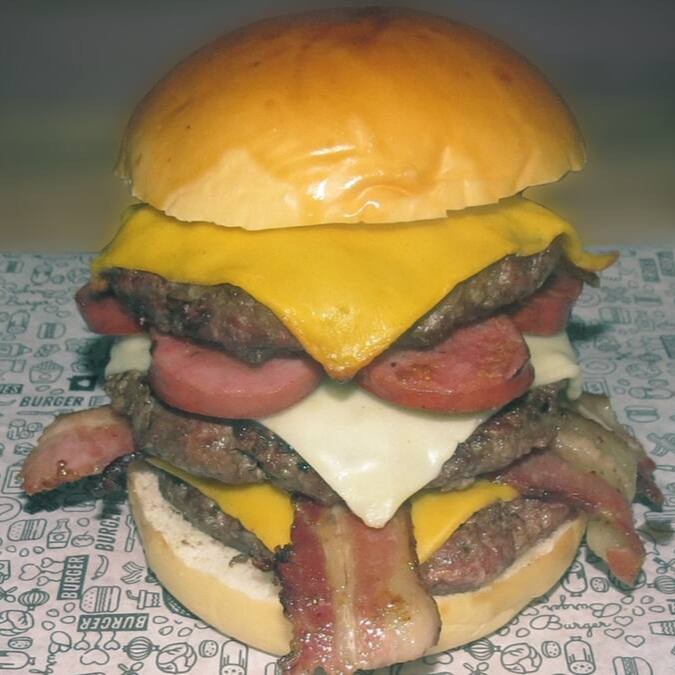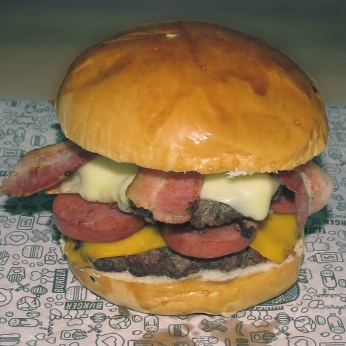 Pão amanteigado, 3 carnes de 140g, queijo cheddar mussarela cheddar, bacon e calabresa.