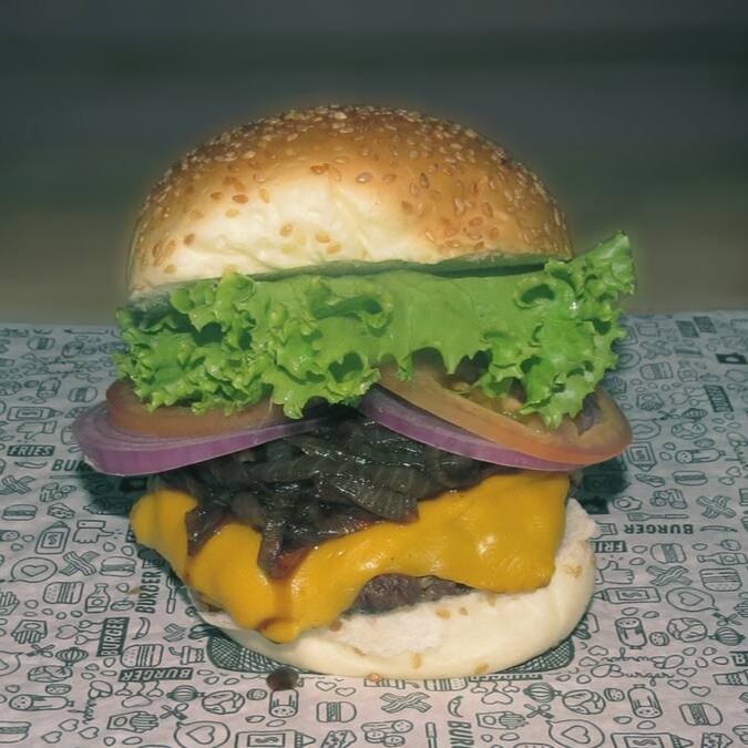 Pão amanteigado, carne de 140g, queijo cheddar ou mussarela, cebola caramelizada e salada ( alface, cebola roxa e tomate).