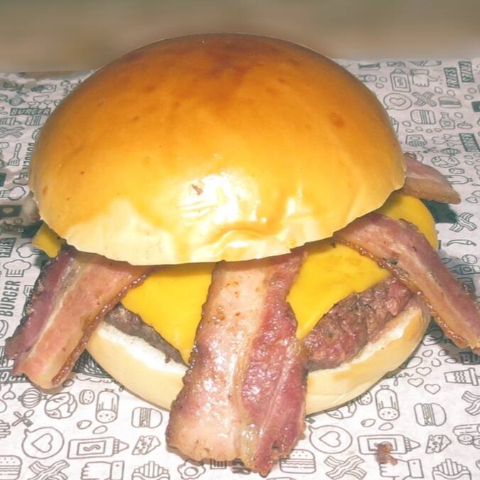 Pão amanteigado, carne de 140g, queijo cheddar ou mussarela e bacon.