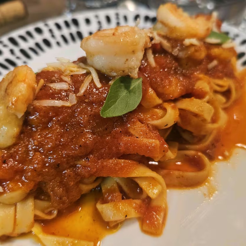 Camarões grelhado no azeite com delicioso molho pomodoro, parmesão ralado e massa de sua preferência