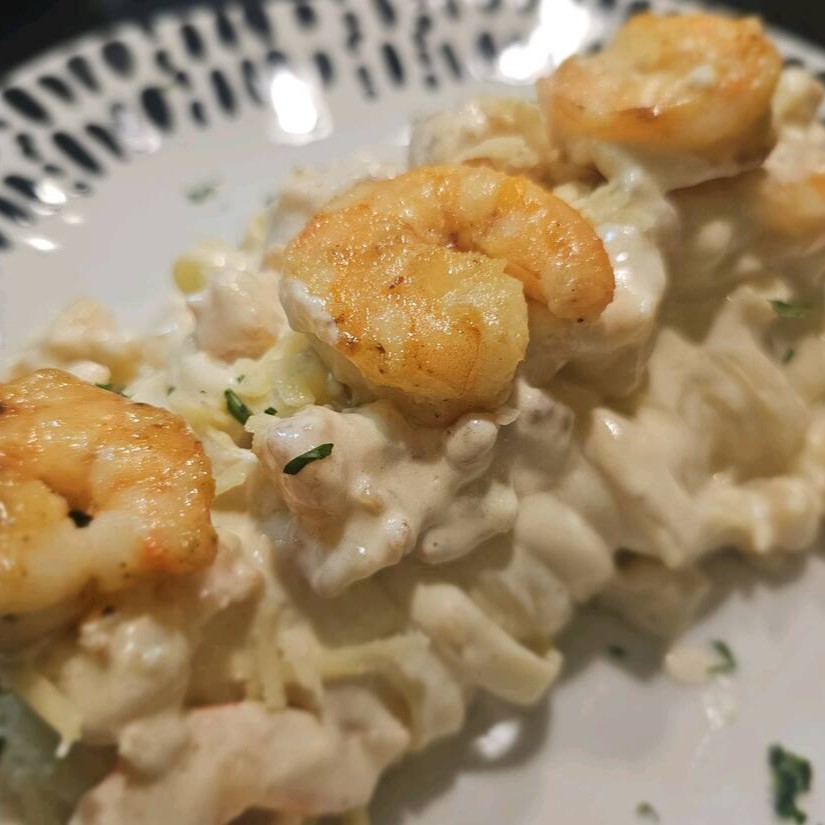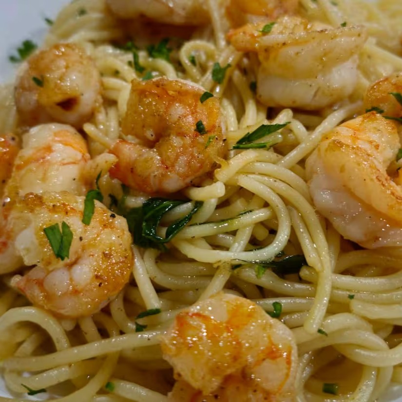 Camarões grelhados na manteiga, deleitados em um delicioso molho branco com massa de sua preferência