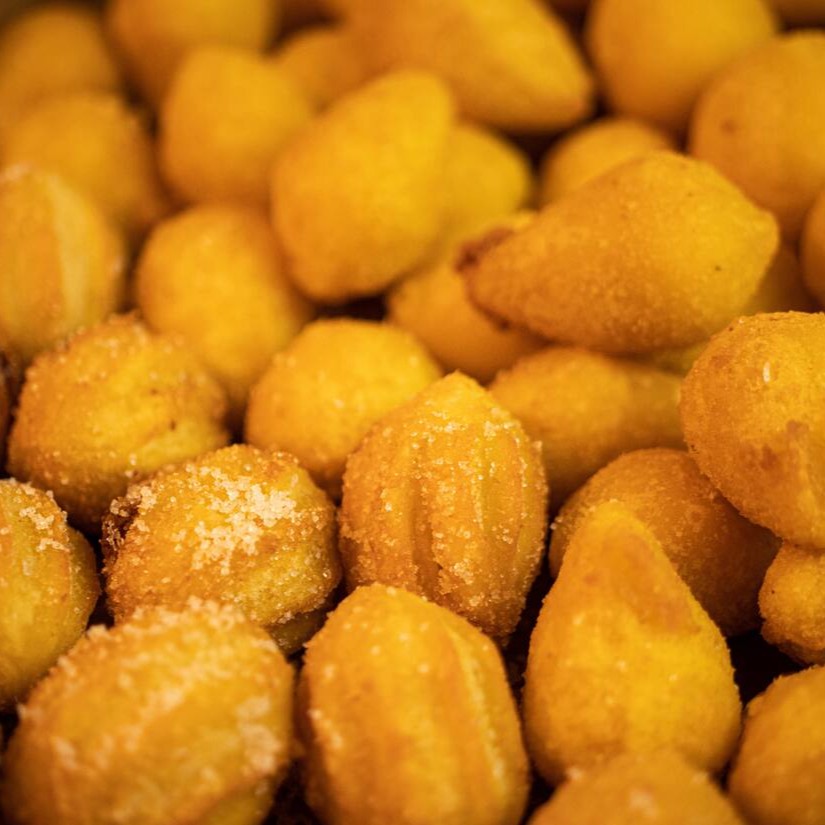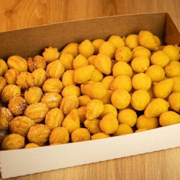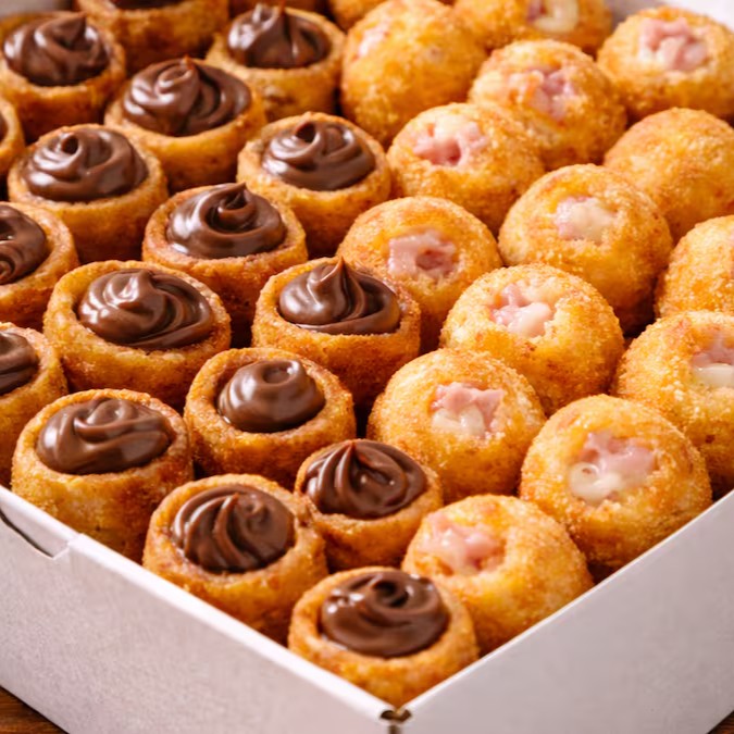 50 unidades de mini coxinha de frango crocante e frita na hora + 50 unidades de mini churros recheados de brigadeiros e empanados no açúcar. ( 100unds)
