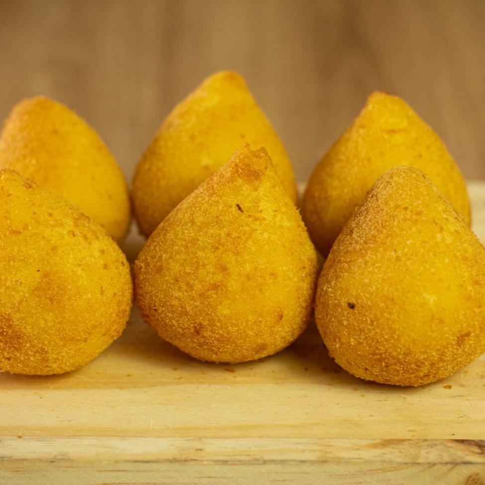 Porção de mini coxinhas de de frango fritas na hora com massa levinha, super crocantes com 25 unidades.