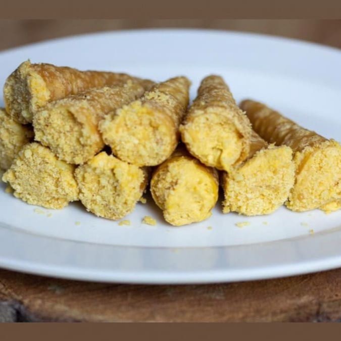 São 25 unidades de mini- canudinhos recheados com patê de frango empanados no queijo parmesão.