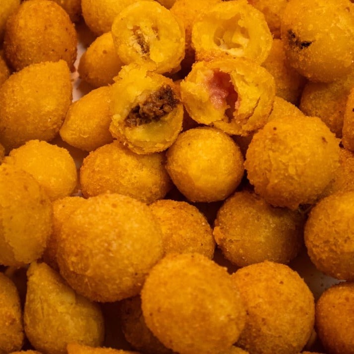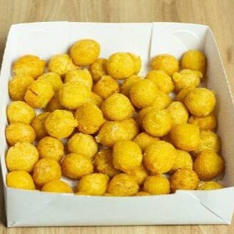 A nossa porção de bolinhas de queijo é feita de uma massa que derrete na boca super crocante e sequinha com queijo mozarela.