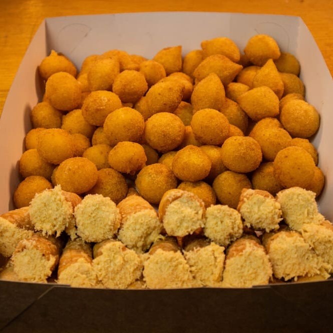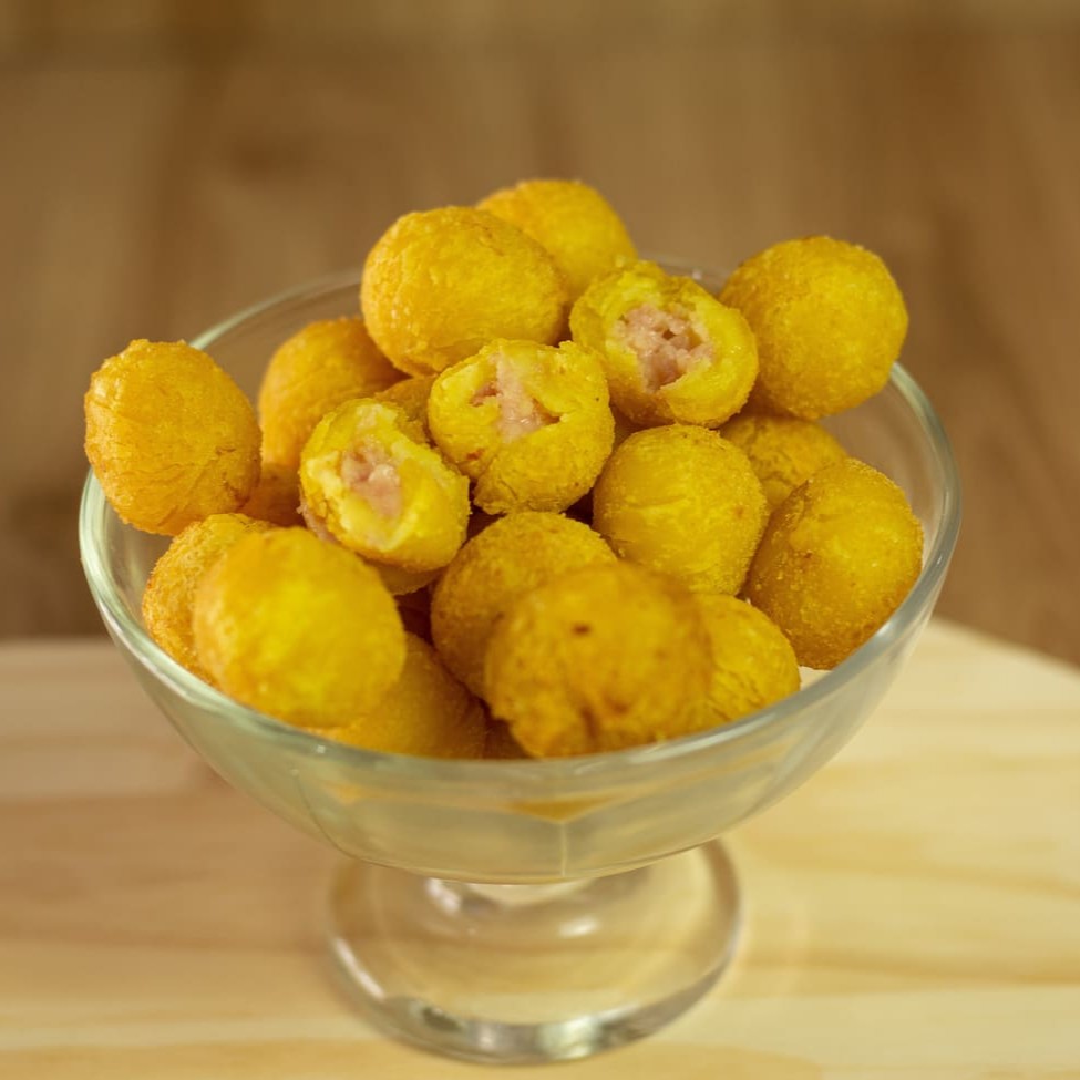 Porção e mini bolinha de queijo com presunto com 25 unidades fritas na hora