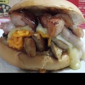 Pão bola, frango, bacon, queijo, presunto, cebola,salada ,batata palha e molho chesse