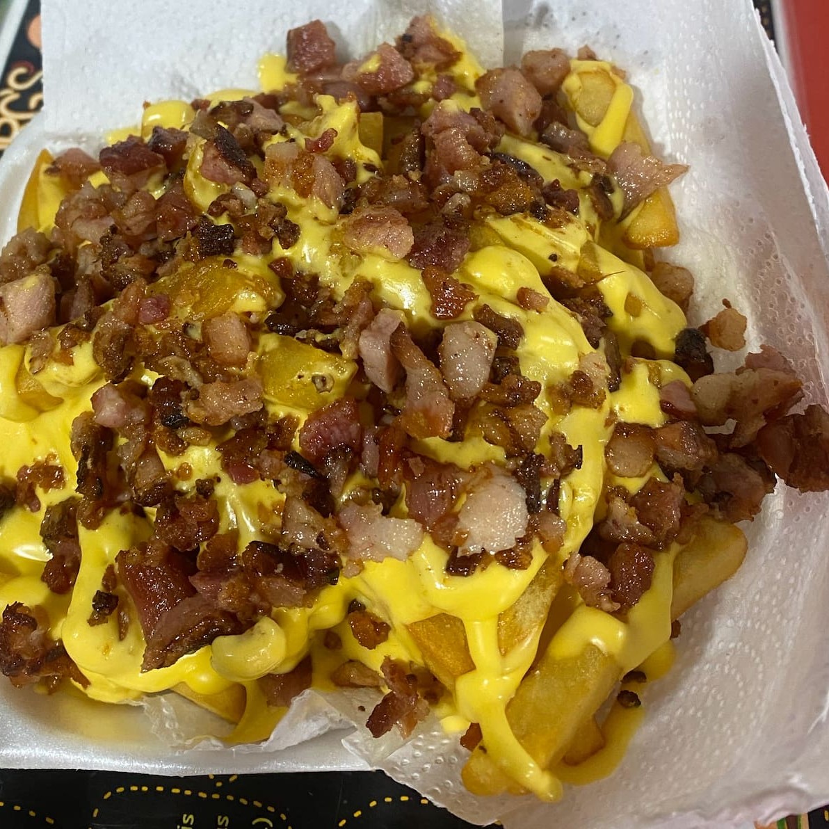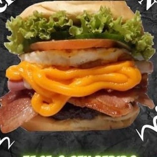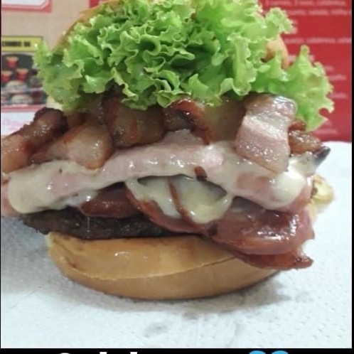 Pão bola, carne, bacon, calabresa, queijo, ovo, salada e batata palha.