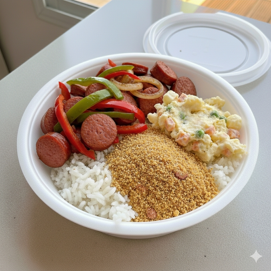 chapa de calabresa com adicional de batata acompanhado de baiao, salada e farofa.