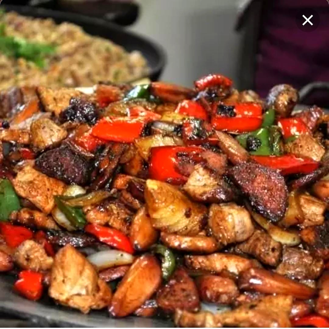 chapa mista. acompanha carne, frango, calabresa´, baião, farofa e salada.