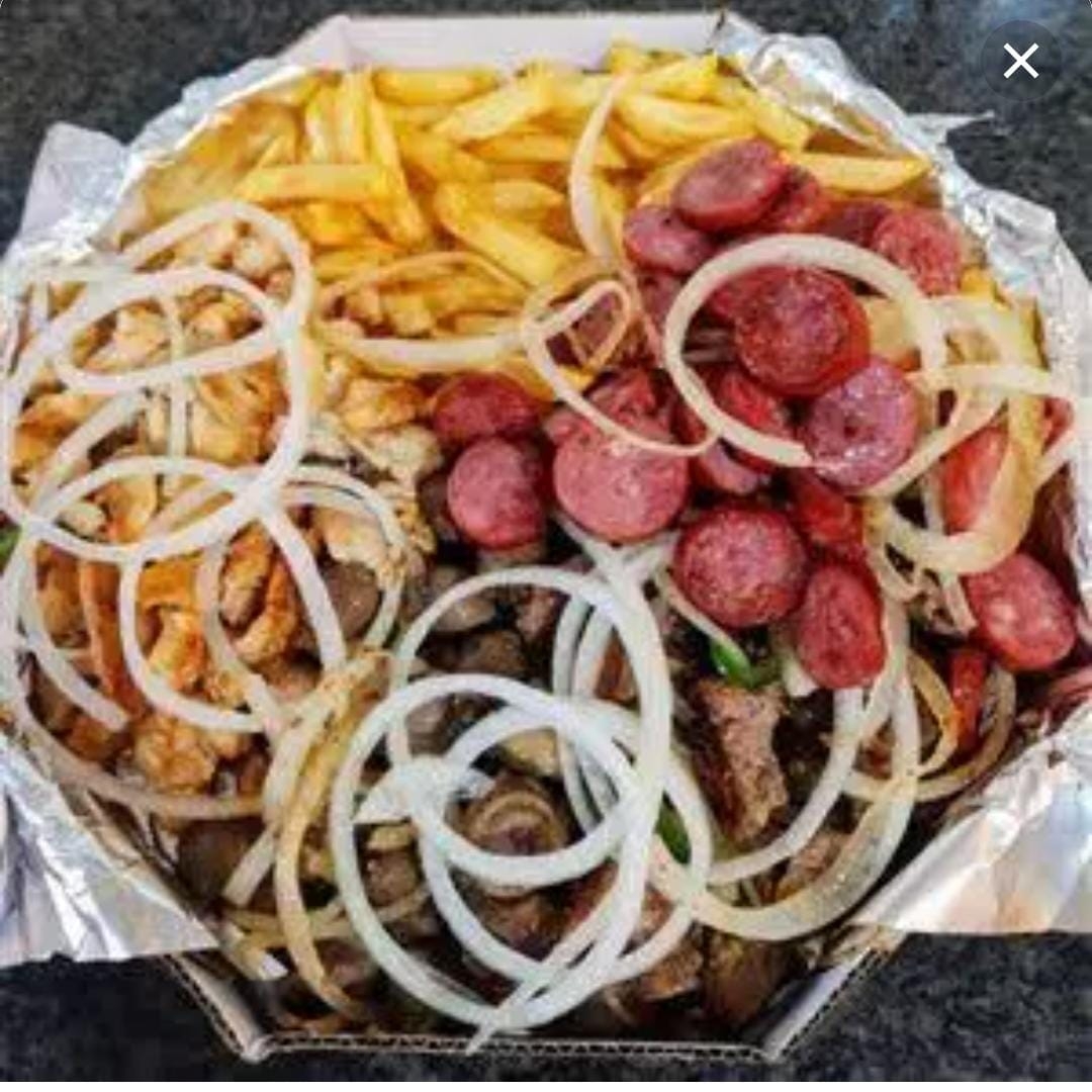 chapa mista + batata. acompanha baião, farofa e salada.( serve ate 4 pessoas)