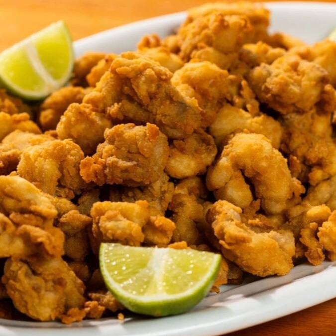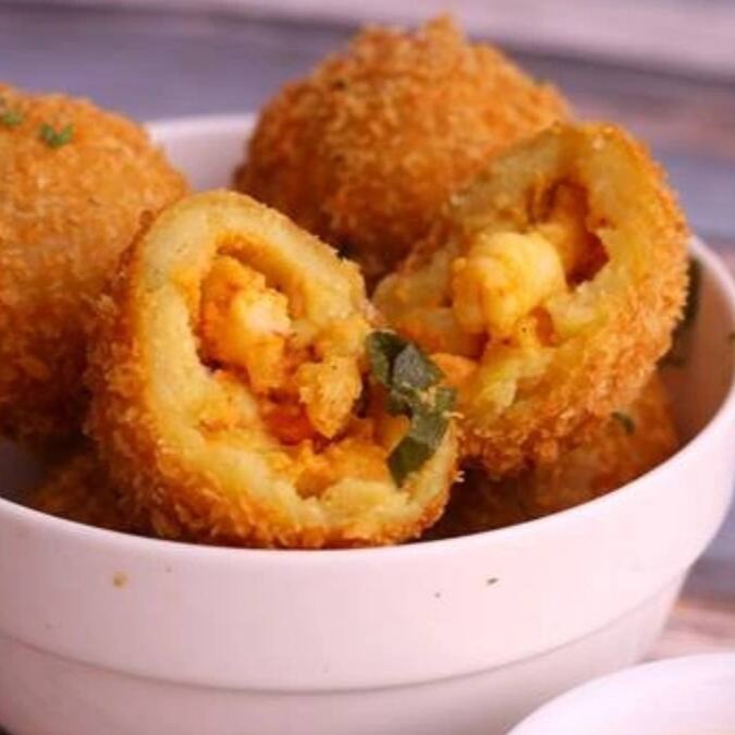 Delicioso Bolinho de camarão, massa especial empanada na farinha internacional. Acompanha molho da casa.