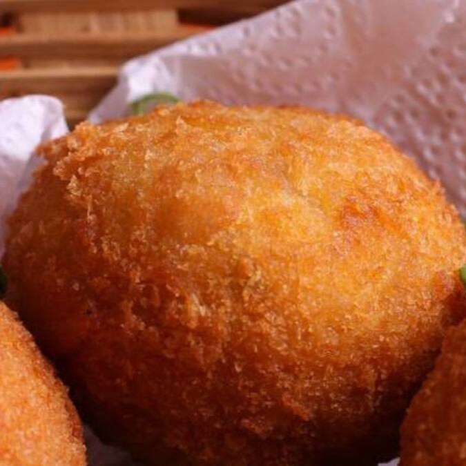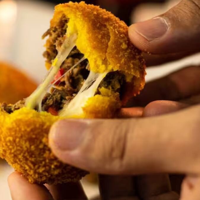 Delicioso bolinho de carne & queijo, massa especial empanado na farinha internacional. acompanha molho rosê