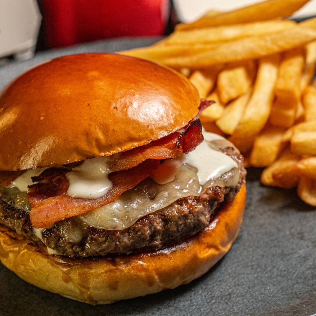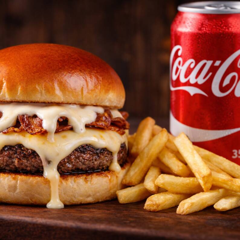 Pão, carne, queijo, molho da casa, creme artesanal de bacon e cebola crispy. + batata de 120g + Coca-Cola Lata 350 ml