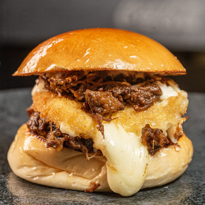 Pão, costela bovina desfiada, queijo mussarela empanado e molho da casa.